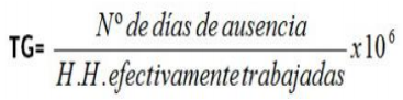 - En el 5.2.16, que la Tasa de Gravedad: es el número de días de ausencia al trabajo de los lesionados por millón de horas trabajadas por todo el personal en el período considerado. Al tiempo de ausencia al trabajo (días perdidos), deberá agregarse el número de días necesarios (días cargo) de acuerdo con las tablas internacionales para valorar las incapacidades permanentes y muertes. La relación es la siguiente: